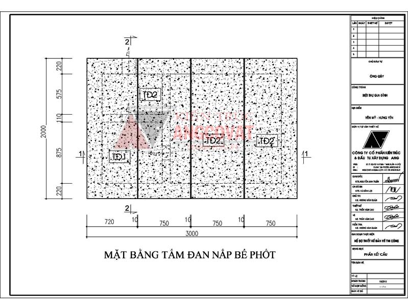 Tấm đan được đổ bằng bê tông cốt thép M250, thép đan ngang không chịu lực sử dụng thép D10, thép đan dọc chịu lực sử dụng thép D12a150. Trên mỗi tấm đan được gắn các móc thép D10 cách mép tấm đan bằng 1/4 chiều dài toàn bộ tấm đan. Các móc thép để thao tác khi thi công lắp đặt bể phốt.