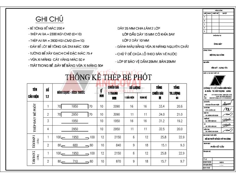 Bảng ghi chú vật liệu sử dụng và thống kê cốt thép chi tiết bể phốt.