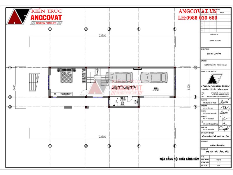 Mặt bằng tầng hầm cùng cách sắp xếp phòng ngủ 20m2 hài hòa có gara, 1 phòng ngủ