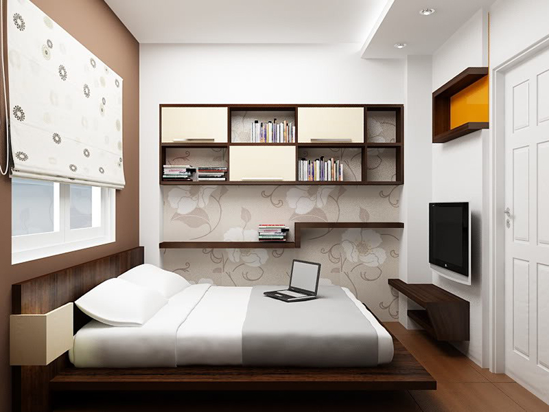 Giường ngủ cho phòng ngủ chật lý tưởng nhất là thiết kế nhỏ gọn, nếu phòng 1 người, giường có thể chọn lựa kích thước 1,2x2m. Nếu phòng ngủ cho vợ chồng, giường có thể sử dụng từ 1,4x2m đến 1,6x2m, giường ngủ có tích hợp tủ kéo bên dưới giúp tận dụng không gian chứa đồ. Thiết kế cách sắp xếp phòng ngủ 20m2 bố trí tủ quần áo, tủ đồ, bạn có thể dùng hệ kệ treo tường với các loại hộc chứa làm bằng chất liệu mây hoặc sắt uốn. Chiếc kệ treo để chứa túi xách, đồ đạc cá nhân, tránh đồ để dưới dàn nhà thêm nhỏ hẹp.