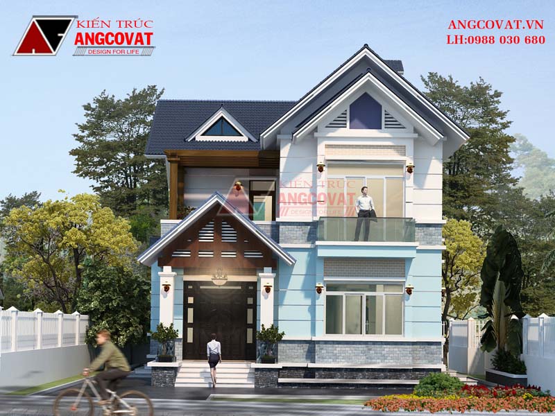Thiết kế mẫu nhà vuông 2 tầng nông thôn màu xanh thanh thoát 12x12m