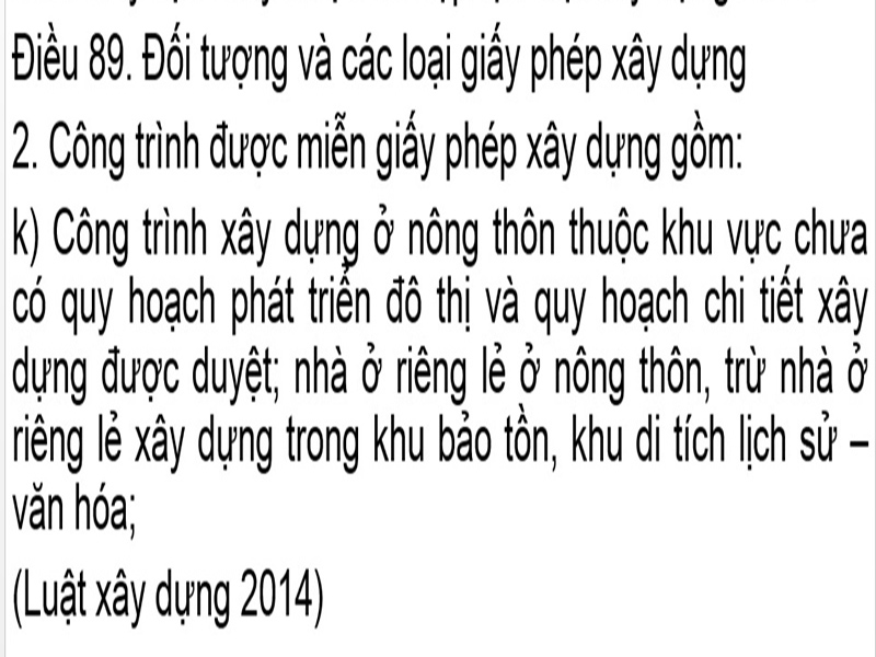 Tuy nhiên, các khoản giấy phép xây dựng ở khu vực nông thôn có thể được miễn từ 1/1/ 2015 bởi xây dựng nhà ở riêng lẻ ở nông thôn không còn cần giấy phép xây dựng trừ nhà ở riêng lẻ xây dựng trong khu bảo tồn, khu di tích lịch sử - văn hóa. Quy định này được đề cập tại Luật xây dựng 2014 như sau: