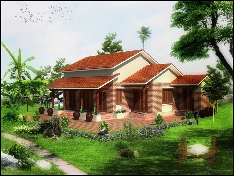 Thiết kế mẫu nhà vuông 2 tầng nông thôn chữ L mái ngói