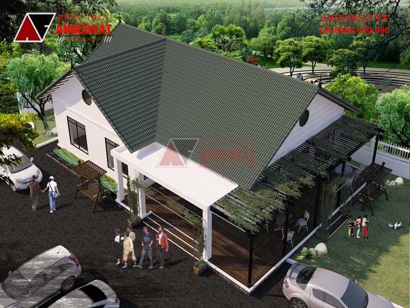 Phối cảnh mái mẫu biệt thự nhà vườn 150m2 với không gian xanh mát
