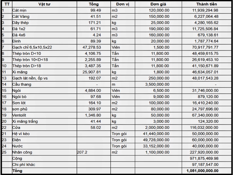 * Trường hợp đổ bê tông mái bằng và mái dốc, chi phí là: 1.157.900.000,00