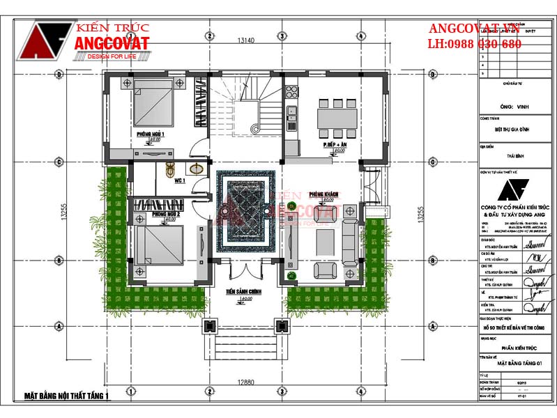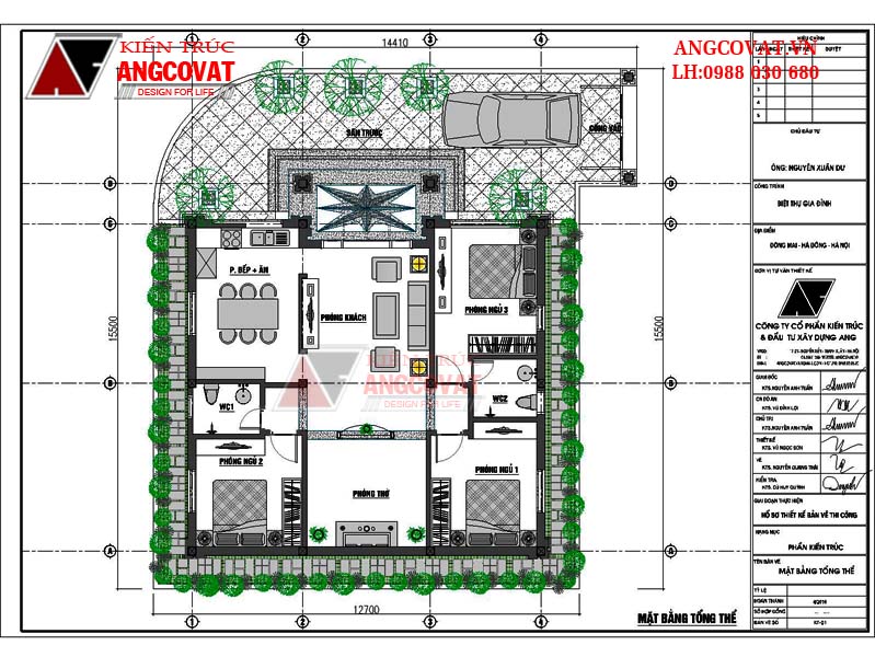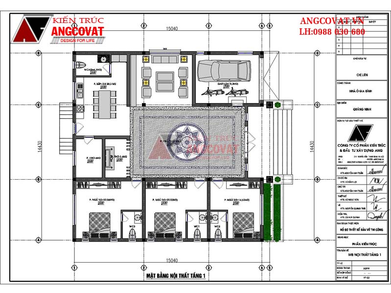 1.2: Thiết kế nhà 1 tầng hình vuông diện tích 200m2 của chị Liên- Móng Cái