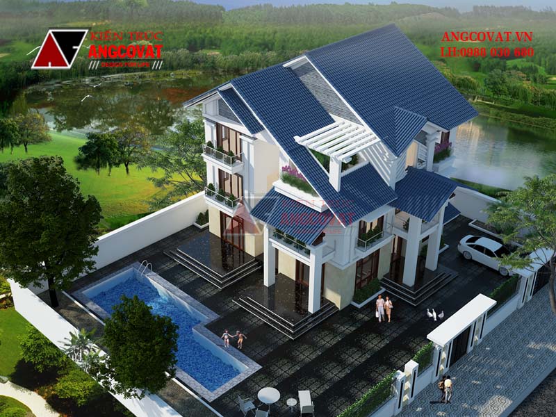 Hệ thống mái dốc, mái giật cấp chữ A ấn tượng và thiết kế bể bơi hứa hẹn những không gian sống tuyệt vời cho bạn và gia đình. Đặc biệt, hệ thống khối đua ban công rộng, có cây cảnh, bồn hoa cho phép ngôi nhà thể hiện được sự hiện đại, đặc biệt trong kiến trúc công trình.