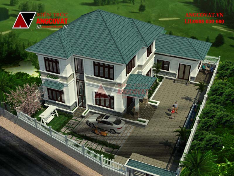 Mẫu ban thiet ke biet thu 2 tang hình vuông kích thước 12x10m thiết kế nhà cho gia đình anh Vinh ở Thái Bình. Diện tích ngôi nhà là 110m2, công trình nhà ở được đánh giá là thiết kế nhà hiện đại, sang trọng tuy nhiên vẫn mang hơi hướng thiết kế biệt thự kiểu thái bởi thiết kế mái đặc trưng.