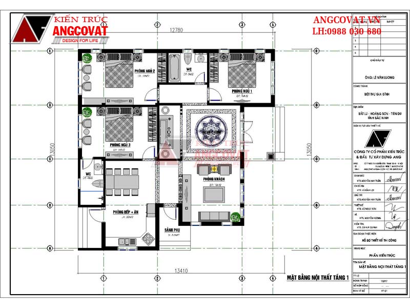 Công năng sử dụng: phòng khách + phòng thờ (34m2), tiền sảnh (8,5m2), phòng ngủ 1 (14,5m2), phòng ngủ 2 (11,5m2), phòng ngủ 3 (12m), phòng bếp + ăn (14m2), WC1 (2,6m2), WC 2 (5,8m2), sảnh phụ (8,2m2).