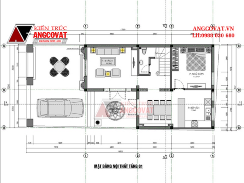 - Tầng 1: Sảnh chính 10m2, Phòng khách + thờ gia tiên: 20m2, Phòng bếp ăn: 16m2, Phòng ngủ 1: 15m2