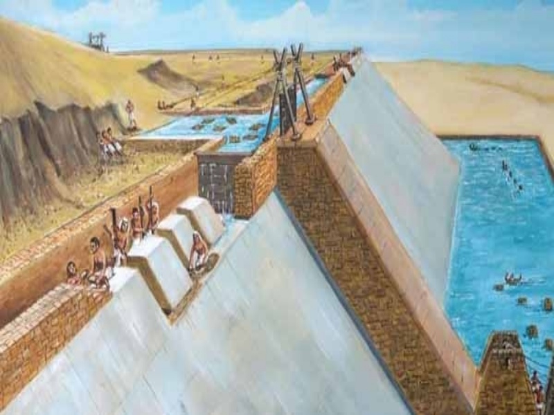 Theo các nhà khoa học nghiên cứu về nghệ thuật kiến trúc kim tự tháp Ai Cập, người cổ đại đã dùng nước để làm cho nền móng kim tự tháp chính xác, bằng phẳng và cân đều. Kiến trúc sư đã tạo nên một đường kẻ rãnh chạy dọc suốt 231m chiều dài của một cạnh kim tự tháp rồi họ đổ nước vào đó giống như chiều dài một ống thủy. Theo dõi đường nước chảy bạn sẽ biết được nền móng đã bằng phẳng và cân đều hay chưa.