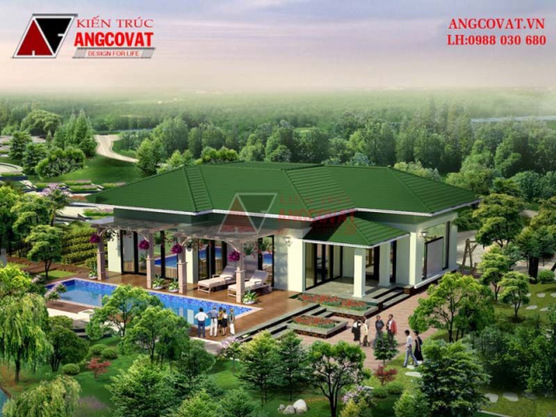 Công trình biệt thự tân cổ điển 1 tầng san vườn rộng có nên xây bể bơi gia đình sang trọng ?