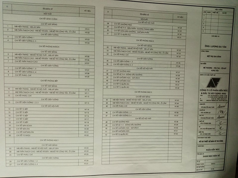 - Bảng danh mục các bản vẽ chi tiết