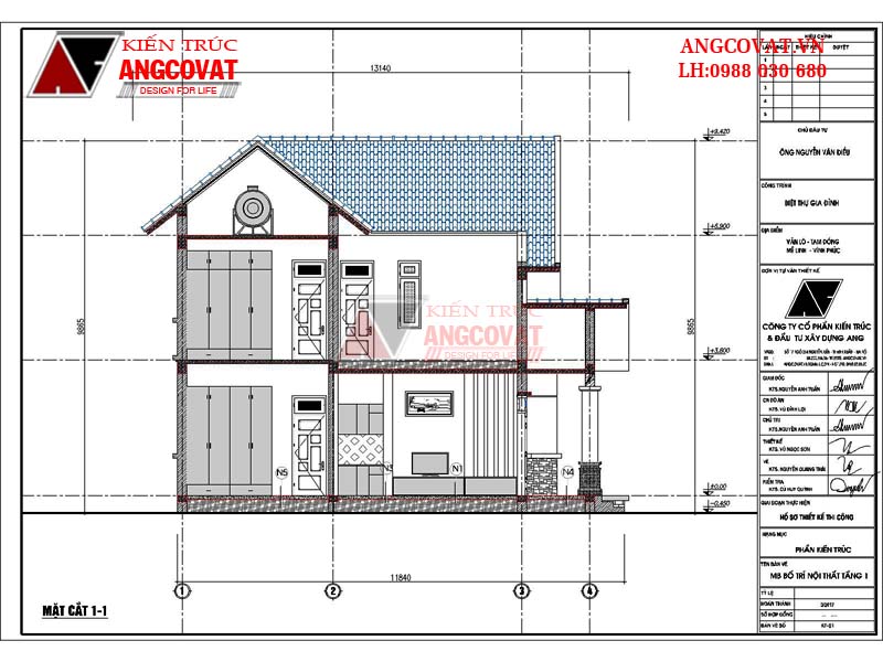 Mặt cắt 1 - 1 bản vẽ thiết kế nhà 2 tầng 8x10m