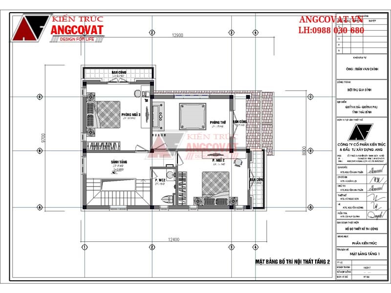 + Tầng 2: Phòng thờ 18m2, ban công của phòng thờ 3m2, phòng ngủ 2 17m2, ban công của phòng ngủ 2 3,5m2, sảnh tầng 8m2, WC2 4m2, phòng ngủ 3 18,5m2, ban công của phòng ngủ 3 4,2m2.