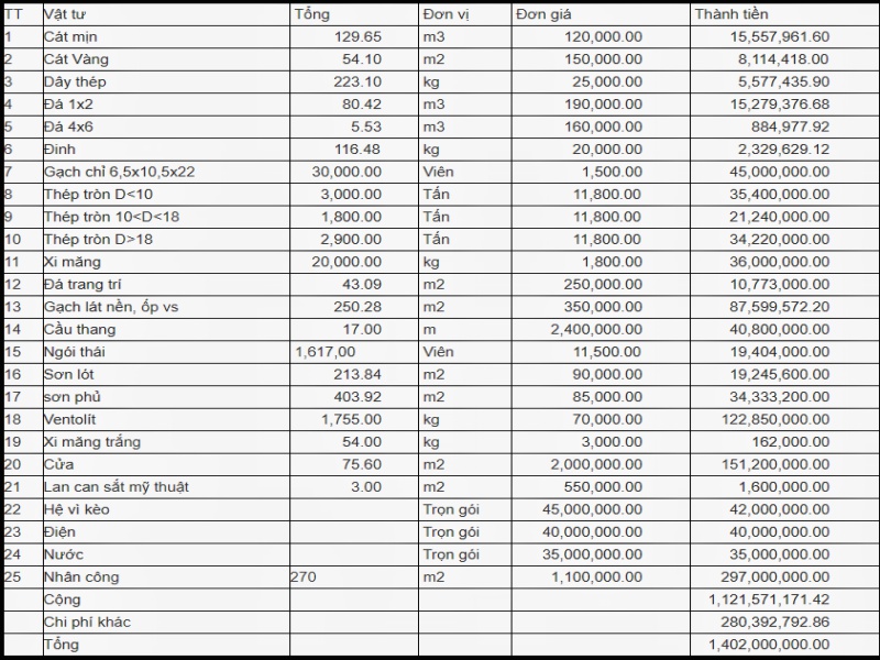 + Trường hợp đổ bê tông mái bằng và mái dốc, chi phí là: 1,261,800,000.00