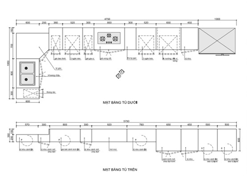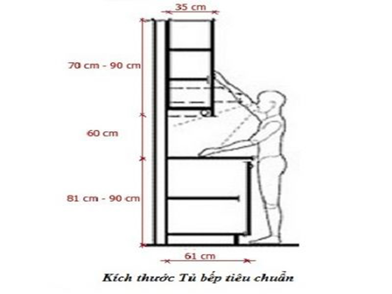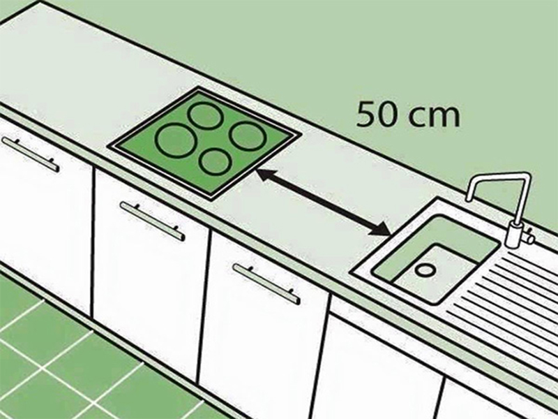 - Kích thước các lối đi các khoảng cách giữa bếp lò và bồn rửa chén, khoảng cách rộng tối thiểu 600 để khi rửa bát tránh văng nước vào bếp. Đồng thời nó cũng là khoảng đệm để ta có thể chứa các thiết bị như nồi, xoong, thớt,... trước khi đặt lên nấu.
