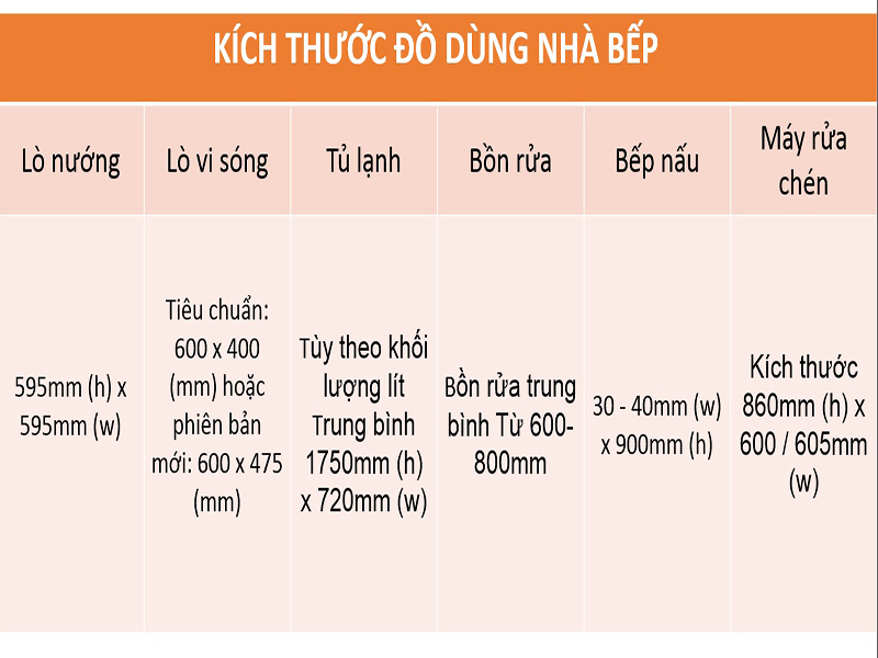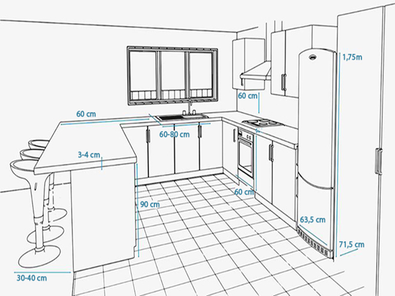 Để sử dụng đúng diện tích phòng bếp tiêu chuẩn phù hợp thì việc đo kích thước các đồ dùng bếp và thiết bị nhà bếp là rất quan trọng. Sau đây, Angcovat sẽ cung cấp sẵn cho bạn các chi tiết một vài đồ dùng nhà bếp và thiết bị nhà bếp khác nhau phù hợp nhu cầu gia đình bạn. Một vài phép đo dưới đây được ứng dụng phổ biến trong thiết kế nhà bếp với hình dáng chữ U, hình chữ L và nhà bếp song song có đảo bếp: