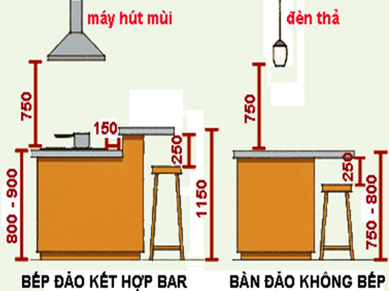 - Chiều cao bếp đảo kết hợp bar thì bàn đảo cao từ 800-900, chiều cao bar cao 1150, chiều cao từ mặt bếp đến đáy máy hút mùi là 750. Còn chiều cao bàn đảo không có bếp là từ 750 - 800, đèn thả ở trên nếu có thì cao cách mặt bàn 750 mới thao tác rõ được. Chiều cao mặt ghế cách đáy bàn tối thiểu 250 thì ngồi mới thoải mái không bị cấn đầu gối.