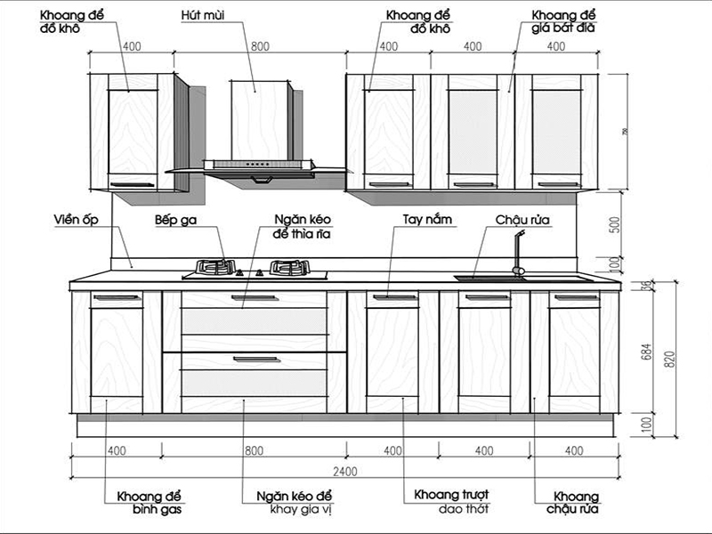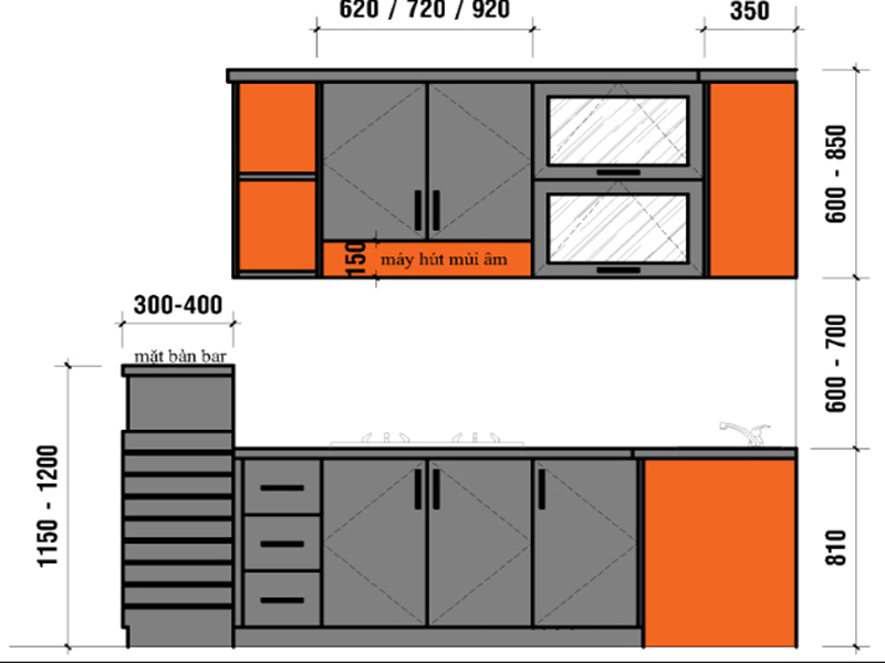 - Chiều cao tủ bếp trên, tủ bếp dưới và khoảng cách giữa 2 tủ bếp mình đã nói ở trên hoặc bạn có thể xem hình.