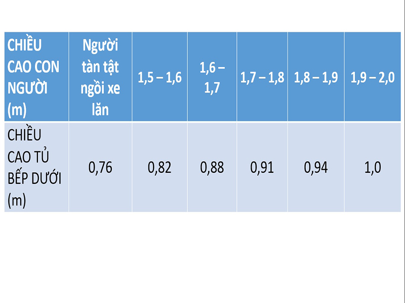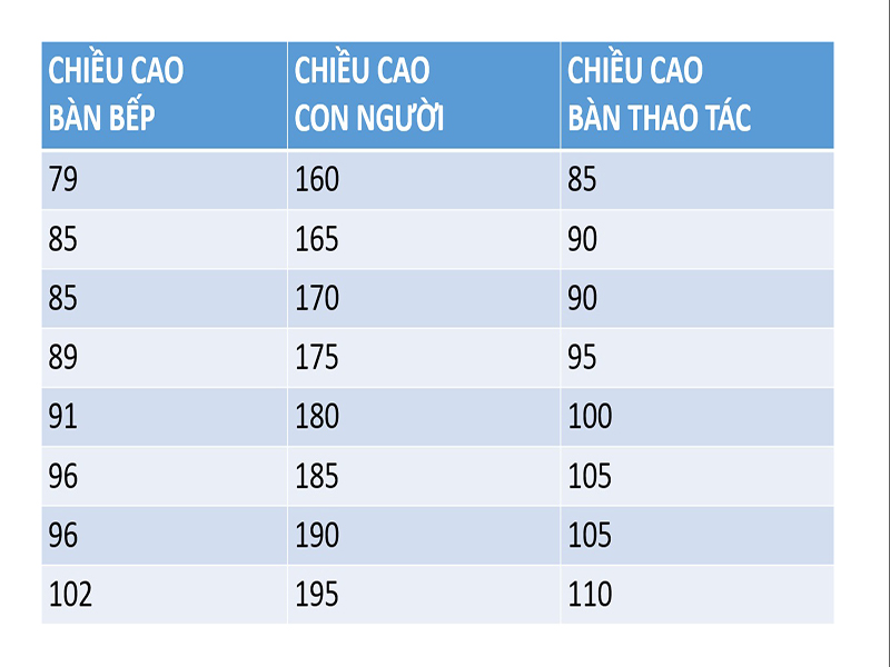 Ngoài kích thước các thiết bị trong phòng bếp bao nhiêu m2 là hợp lý, các hộ gia đình nên chú ý chiều cao các thiết bị như sau: