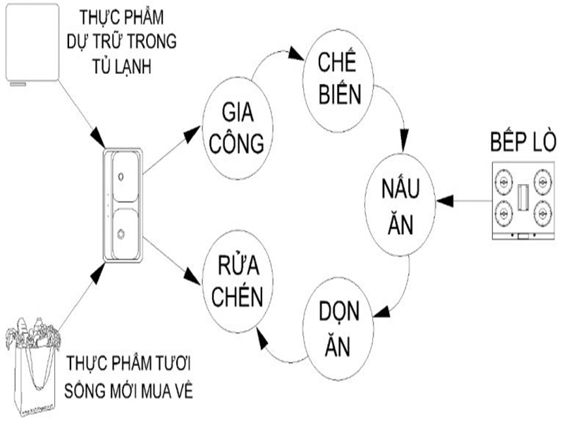 Căn cứ vào qui trình hoạt động để xác định phòng bếp bao nhiêu m2 là hợp lý