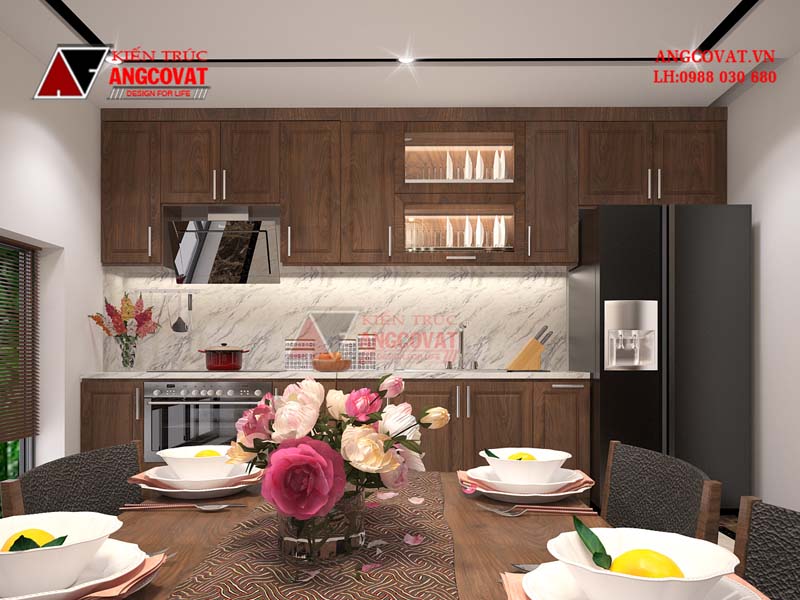 Diện tích phòng bếp tiêu chuẩn với kích thước các trang thiết bị nhà bếp bố trí khoa học mang đến không gian bếp hoàn hảo, tận dụng tối đa khoảng trống, sử dụng tối ưu nhất diện tích bếp tối thiểu đáp ứng cho nhu cầu nấu nướng sinh hoạt của các thành viên trong gia đình.