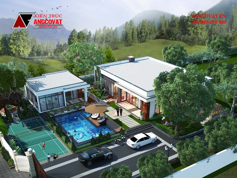 Mẫu thiết kế này ngoài ghi điểm bởi kiến trúc biệt thự sân vườn đẹp thì còn có điểm nhấn là hồ hơi với làn nước xanh trong, điểm tô thêm sắc xanh làm mát lành hơn không gian sinh sống. Cùng chúng tôi tìm hiểu chi tiết hơn về mẫu biệt thự có hồ bơi đẹp của chú Duẩn tại Hòa Bình do KTS Angcovat thực hiện trong bài viết ngay sau đây.