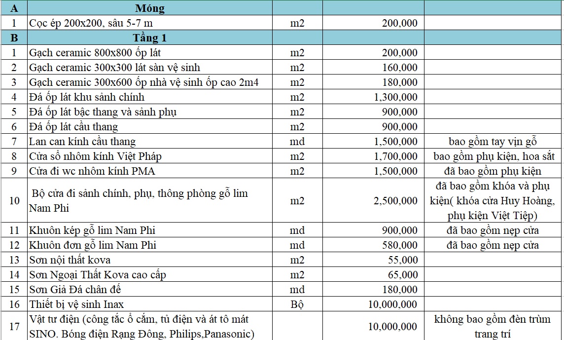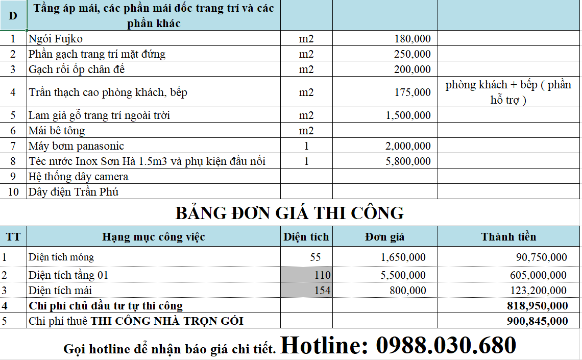 * Đơn giá trên là đơn giá chủ đầu tư trực tiếp thi công