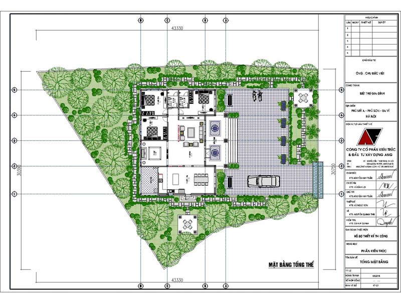 Quan sát bản vẽ phối cảnh tổng thể có thể thấy được sự khang trang về mặt quy hoạch. Trên ô đất diện tích 30x43m rộng rãi, ngôi nhà được đặt ẩn sau vườn cây xanh mát, cây cối phát triển tươi tốt, được cắt tỉa gọn gàng. Đứng từ xa cũng chỉ có thể thấy thấp thoáng dáng mái xuôi chiều cân đối màu xanh dương.