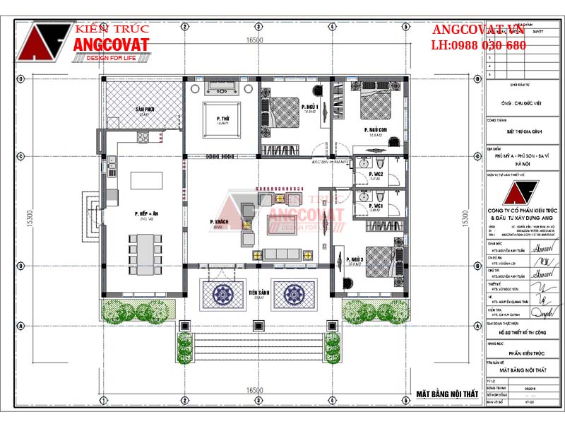 Tiền sảnh: 25m2, Phòng khách 42m2, Phòng thờ 14.8m2, Phòng bếp ăn: 34.5m2, Sân phơi 10m2, Phòng ngủ 1: 14.5m2, Phòng ngủ 2( phòng ngủ con): 14.5m2, Phòng ngủ 3: 15.8m2, WC1: 3.8m2, WC2: 4.3m2.