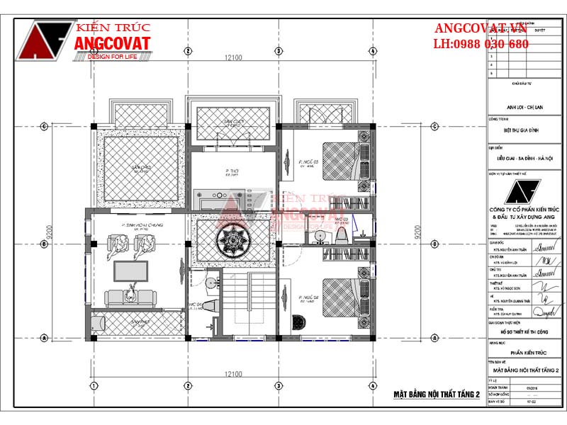 Bố cục mặt bằng nội thất tầng 2 biệt thự 2 tầng mặt tiền 13m mái thái