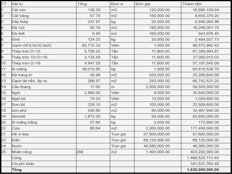 * Trường hợp chỉ làm vì kèo lợp ngói, đóng trần chi phí là: 1.467.000.000,00