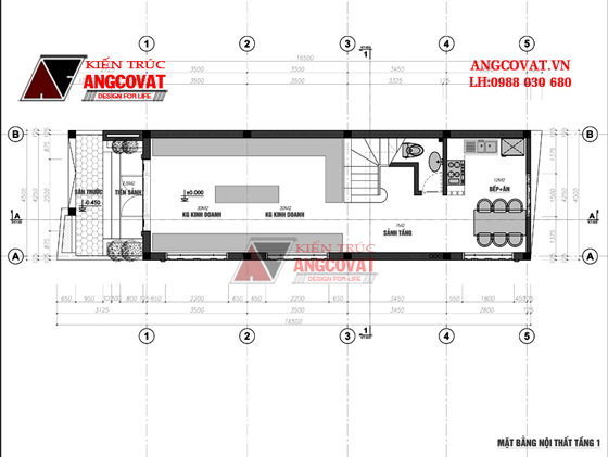 - Tầng 1: 1 phòng để kinh doanh, 1 phòng bếp.