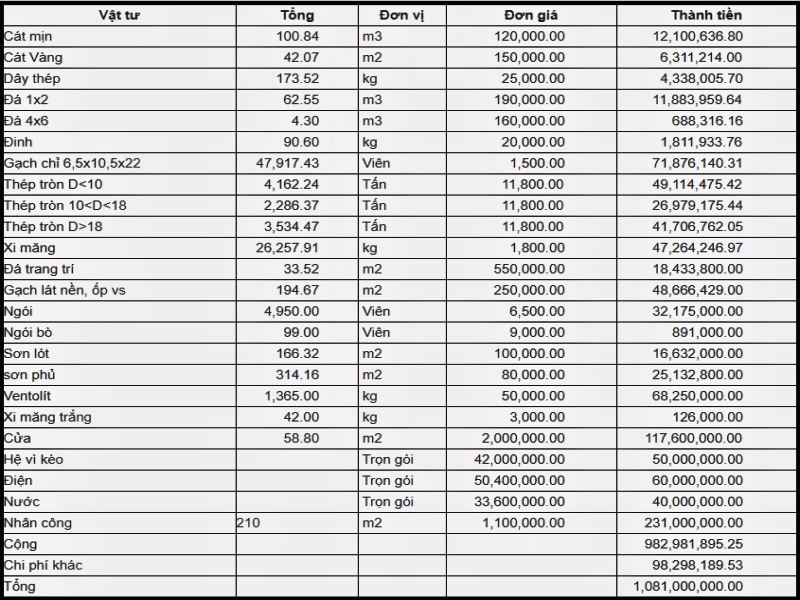 * Trường hợp đổ bê tông mái bằng và mái dốc, chi phí là: 1.189.100.000,00
