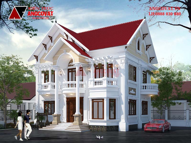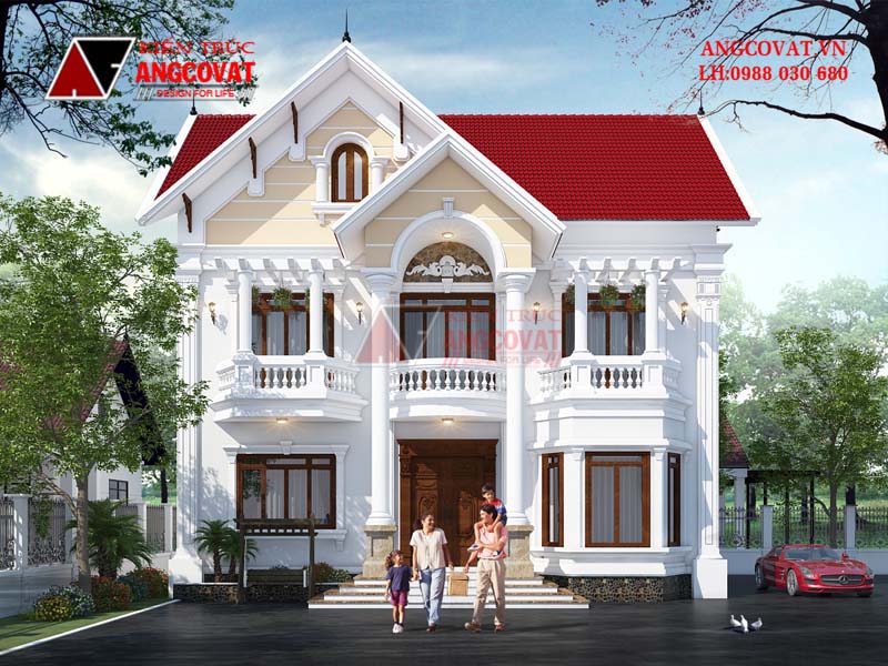 Nổi bật trên nền trắng của tường nhà là màu đỏ cam của mái thái, sự kết hợp này kiến cho thiết kế nhà đẹp 2 tầng 5 phòng ngủ tôn lên vẻ đẹp kiến trúc và mang lại giá trị thẩm mỹ cao cho căn nhà.