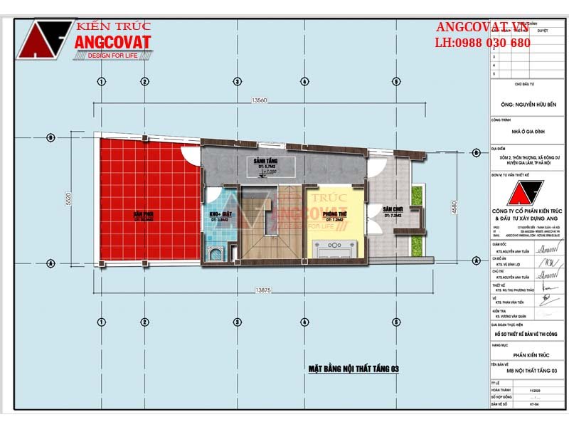 * Tầng 3: sân chơi 7m2; phòng thờ 7,5m2; sảnh thang 5,7m2; sân phơi 30m2; khu giặt đồ