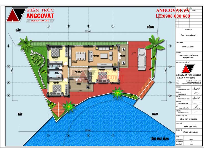 Hình khối tổng thể lô đất không được vuông vắn như những lô đất khác trong các hồ sơ trước đây. Bên cạnh lô đất là một khu vực sông hồ rộng lớn nên chúng tôi lại càng phải cẩn trọng trong từng chi tiết. Tuy nhiên, với kinh nghiệm nhiều năm, đội ngũ kiến trúc sư đã đưa ra phương án tối ưu và àn toàn nhất cho thiết kế nhà mái thái 3 phòng ngủ 1 phòng thờ. Vị trí ngôi ngà được bố trí lui về sau để lại khoảng không gian sân rộng phía trước 2 mặt tiền. Một phía là sông hồ xanh biếc, một phía là góc vườn nhỏ được tạo nên ở sau nhà để trồng cây xanh tăng thêm yếu tố thiên nhiên tươi mát giúp ngôi nhà càng thêm mộc mạc, bình dị khi được kết hợp hài hòa với thiên nhiên.