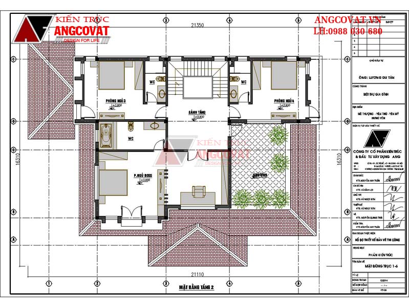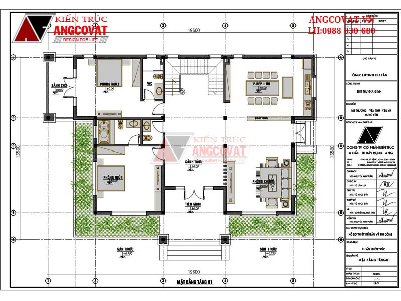 Anh Lương Du Tân ở Hưng Yên đã gọi cho kiến trúc sư tư vấn ANG qua lời giới thiệu của bạn bè. Gọi tới văn phòng tư vấn, anh Tân vô cùng hào hứng nói về yêu cầu của anh về ngôi nhà mới trong tương lai. Được biết, lô đất anh Tân chuẩn bị xây dựng có kích thước 2600m2, trong đó 300m2 dành để xây nhà. Anh muốn xây dựng một ngôi biệt thự 2 tầng 5 phòng ngủ đẹp. Trao đổi qua điện thoại, chúng tôi đã thống nhất vớ anh Tân về phương thức làm việc của công ty. Ngay ngày hôm sau, kiến trúc sư của ANG đã đến trực tiếp Hưng Yên để có thể khảo sát hiện trạng, đo đạc chi tiết về khu đất. Và cuối cùng, sau những ngày làm việc cùng các kiến trúc sư, kĩ sư trong công ty, chúng tôi đã tạo ra một bản vẽ biệt thự 2 tầng đẹp hiện đại.