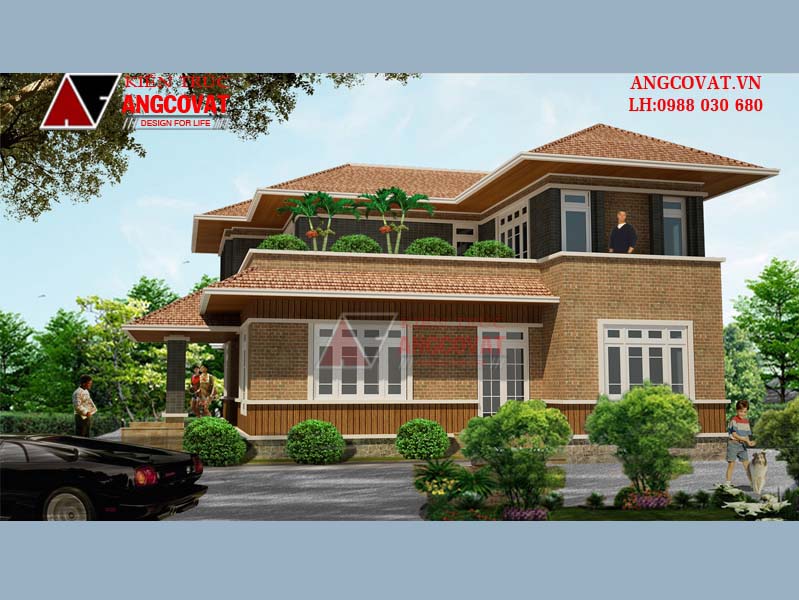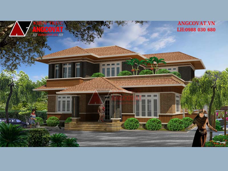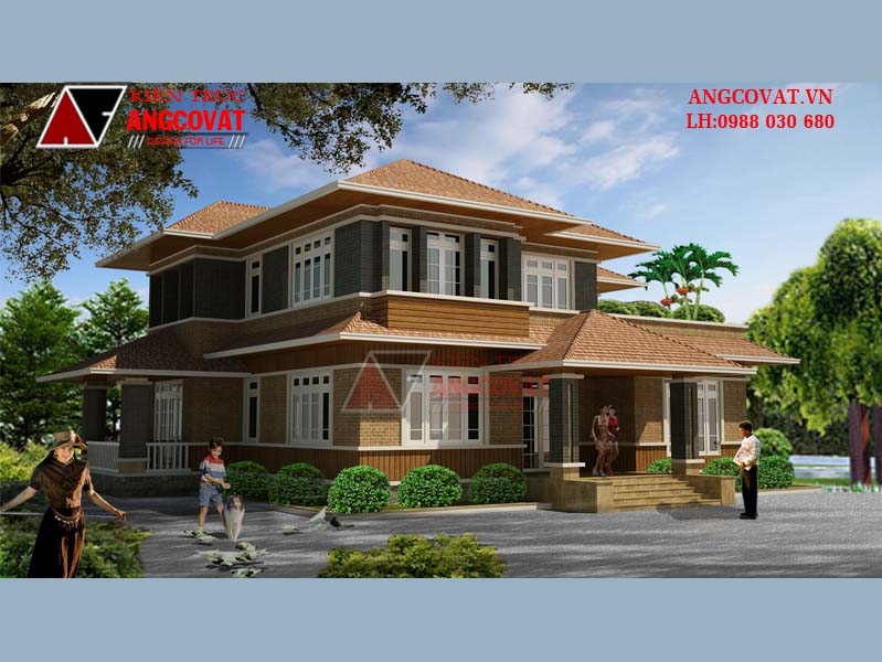 Sở hữu ngoại thất khang trang, ngôi biệt thự hiện đại 2 tầng mái thái được nhiều người yêu thích khi gọi tới Angcovat. Với diện tích 300m2, khối kiến trúc trở nên đồ sộ vô cùng. Các mặt bằng mái đua ra càng mang lại vẻ vững chãi, nhưng không hề rườm rà và cầu kì. Anh Tân là một người khá đơn giản, không thích phô trương nên ngôi nhà cũng mang phong cách như vậy. Sử dụng chủ yếu là vật liệu gạch ốp tường truyền thống, ngôi biệt thự 2 tầng 5 phòng ngủ xinh đẹp của anh Tân vừa giản dị mà vẫn không mất đi vẻ sang trọng vốn có. Hai mặt tiền khiến cho mẫu biệt thự trở nên rộng hơn với các mặt được bố trí thêm nhiều cây xanh, sảnh chính cũng như sảnh phụ đều được trang trí kỹ càng.