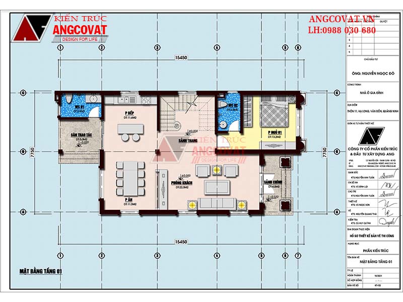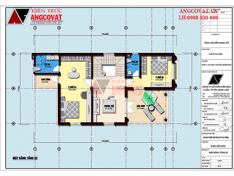 - Diện tích: 105m2/sàn - Thông số: * Tầng 1: sảnh chính 4m2; phòng khách 22,5m2; phòng bếp 11,6m2; phòng ăn 11,5m2; wc1: 3,9m2; sân thao tác: 5m2; phòng ngủ 1: 13,2m2; wc2: 3,5m2 * Tầng 2: phòng ngủ 2: 13,2m2; phòng ngủ 3: 24,4m2; wc3: 3,5m2; ban công: 3,3m2; phòng thờ: 12,4m2; sân chơi 15,4m2; wc4: 5,2m2 |