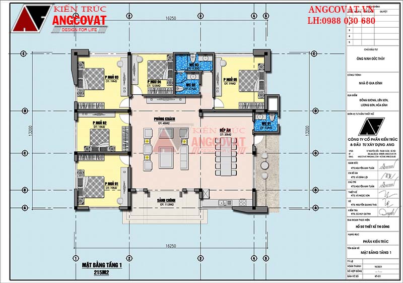 - Diện tích: Nhà 250m2 - Công năng: sảnh chính: 11,5m2; phòng khách 45m2; phòng bếp ăn 35m2; wc1: 3m2; phòng ngủ 1: 19m2; phòng ngủ 2: 15m2; wc2: 3,7m2; phòng ngủ 3: 19m2; phòng ngủ 4: 12,5m2; wc3: 4,4m2; phòng ngủ 5: 19m2 |