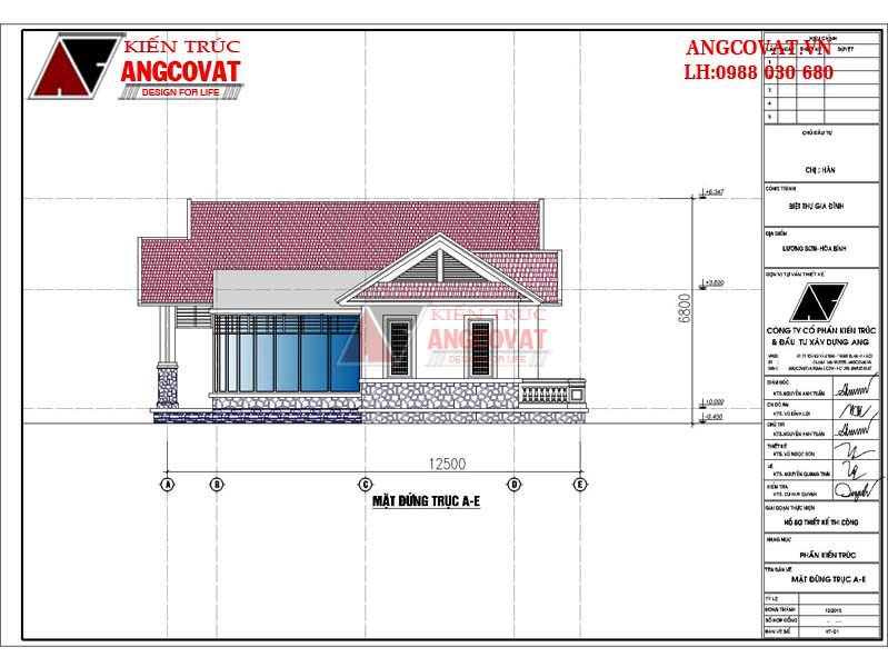 Quan sát bản vẽ mặt đứng trục 1-5 mẫu thiết kế nhà vườn 1 tầng 2 mặt tiền 3 phòng ngủ ở Hòa Bình, ta sẽ có được những hình dung rõ hơn về phần thiết kế mặt tiền của ngôi nhà. Phần chân tường được ốp đá rối đẹp mắt vừa có tác dụng trang trí vừa tạo độ dày, sự chắc chắn nâng đỡ toàn bộ công trình.
