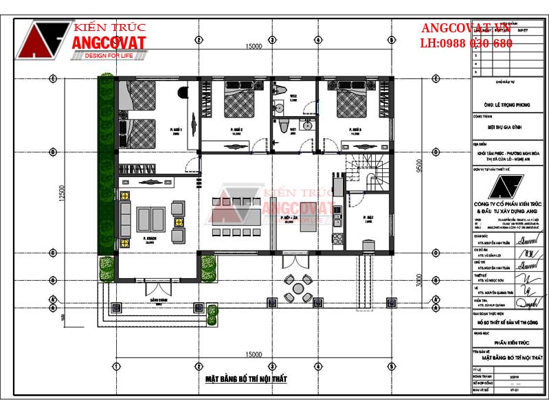 Mặt bằng bố trí nội thất mẫu nhà ở kết hợp nhà thờ cấp 4 kích thước 15x12m 3 phòng ngủ BT130036