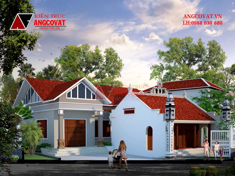 Mẫu thiết kế nhà ở kết hợp nhà thờ cấp 4 3 phòng ngủ mang phong cách kiến trúc truyền thống đặc trưng. Phía trước là nhà thờ họ, phía sau là ngôi nhà của gia đình ông Phong. Vì nhà thờ họ là công trình tín ngưỡng để thờ cúng Tổ tiên yêu cầu sự tôn nghiêm nên kiến trúc sư tuân thủ nghiêm ngặt theo kiến trúc dân gian. Còn nhà ở của gia chủ, thiên về sự nghỉ ngơi, thư giãn nhiều hơn nhưng cũng là nơi thường xuyên đón khách, đặc biệt vào các dịp lễ lạc nên cần phải thể hiện được sự đẳng cấp, sang trọng vì vậy ngoài áp dụng phong cách truyền thống, chúng tôi còn đặc biệt kết hợp với các yếu tố hiện đại nhằm tăng tính thẩm mỹ và nét hài hòa với tổng quan công trình. Những mẫu nhà cấp 4 ở quê như thế này luôn tạo được dấu ấn mạnh mẽ bởi kiến trúc cũng như những ý nghĩa mà công trinh mang đến cho thiết kế nhà đẹp