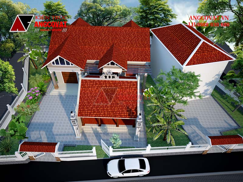 Phối cảnh 2 nhà nhà ở kết hợp nhà thờ 3 phòng ngủ mái ngói diện tích 160m2