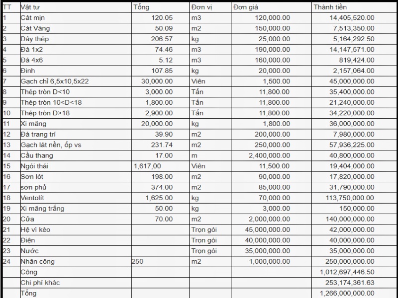 - Lưu ý: Những con số thống kế trên chỉ mang tính tham khảo và có thể có sai số. Số liệu vật tư chính xác phụ thuộc vào nhiều yếu tố như địa phương xây nhà, thời điểm xây nhà, chất lượng vật liệu và giá nhân công xây dựng khác nhau ở các vùng miền…cùng với các chi tiết phát sinh khác. Bên cạnh đó cũng tùy vào vốn đầu tư của gia đình để ước tính chi phí phát sinh khi lựa chọn vật liệu cao cấp hay bình thường. Đơn giá trên là đơn giá chủ đầu tư trực tiếp thi công xây dựng. Lưu ý chi phí khác như đào móng, lấp móng, ép cọc, phát sinh thi công,… được tính bằng 10-15% chi phí tổng.