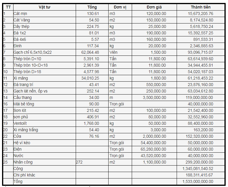 * Trường hợp đổ bê tông mái bằng và mái dốc, chi phí là 1.686.300.000,00