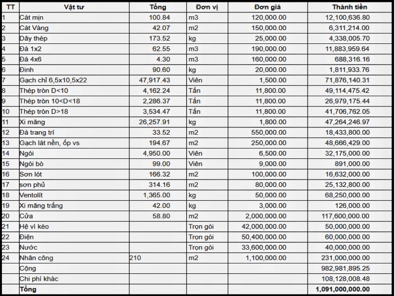 * Trường hợp đổ bê tông mái bằng và mái dốc, chi phí là: 1.200.100.000,00