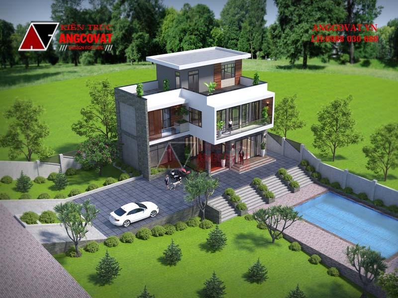 Mẫu thiết kế của Angcovat cập nhật tiện ích hiện đại như bể bơi để các thành viên tận hưởng phút giây vui chơi giải trí bên cạnh bản thân của mình, đồng thời đem lại sự hiện đại, sang trọng cho chủ nhà cũng như căn hộ. Không gian ngoại thất của mẫu nhà 110m2 3 tầng thể hiện được giá trị mới mẻ, độc đáo và khác biệt cho không gian ngoại thất. Không gian của bể bơi, sân vườn, cây cỏ.... được tận dụng trong kiến trúc ngoại thất đảm bảo được những khoảng không gian sang trọng, sáng và đáp ứng được mọi nhu cầu của gia đình hiện nay.